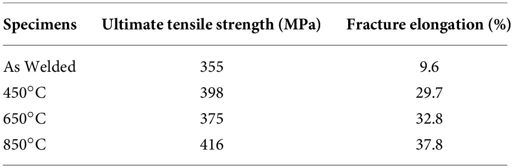 The engineering stress/strain curves for all conditions are presented in Figure 3a–d, and the corresponding tensile properties are listed in Table 3. The as-welded joint showed very limited ductility (9.6%) with a ultimate tensile strength (UTS) of 355 MPa, thus demonstrating a rather brittle behavior mainly due to the presence of residual stresses and microstructural heterogeneity.
